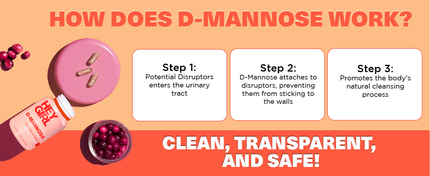 - Combines D-Mannose with cranberry, hibiscus, and dandelion extracts.